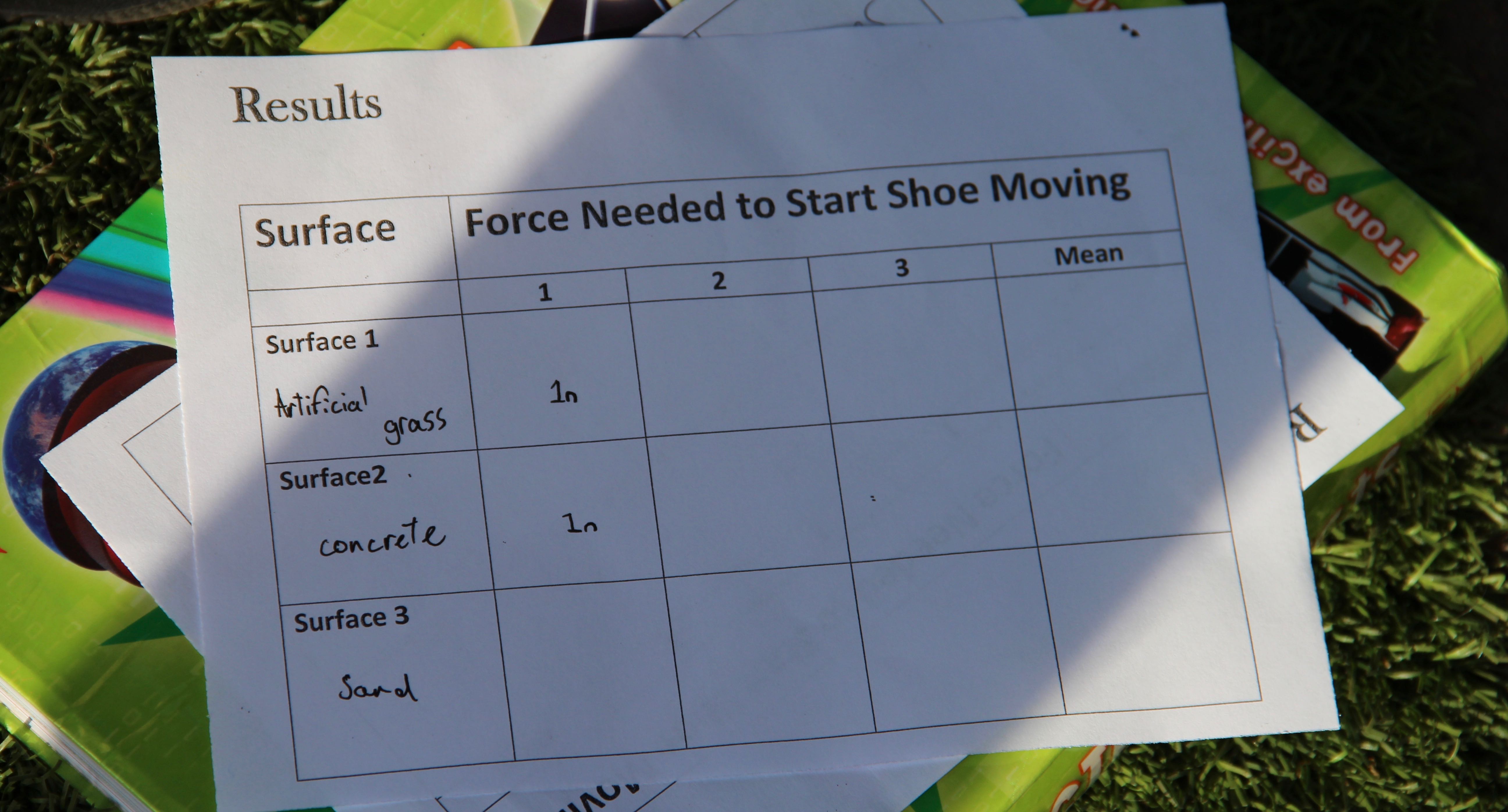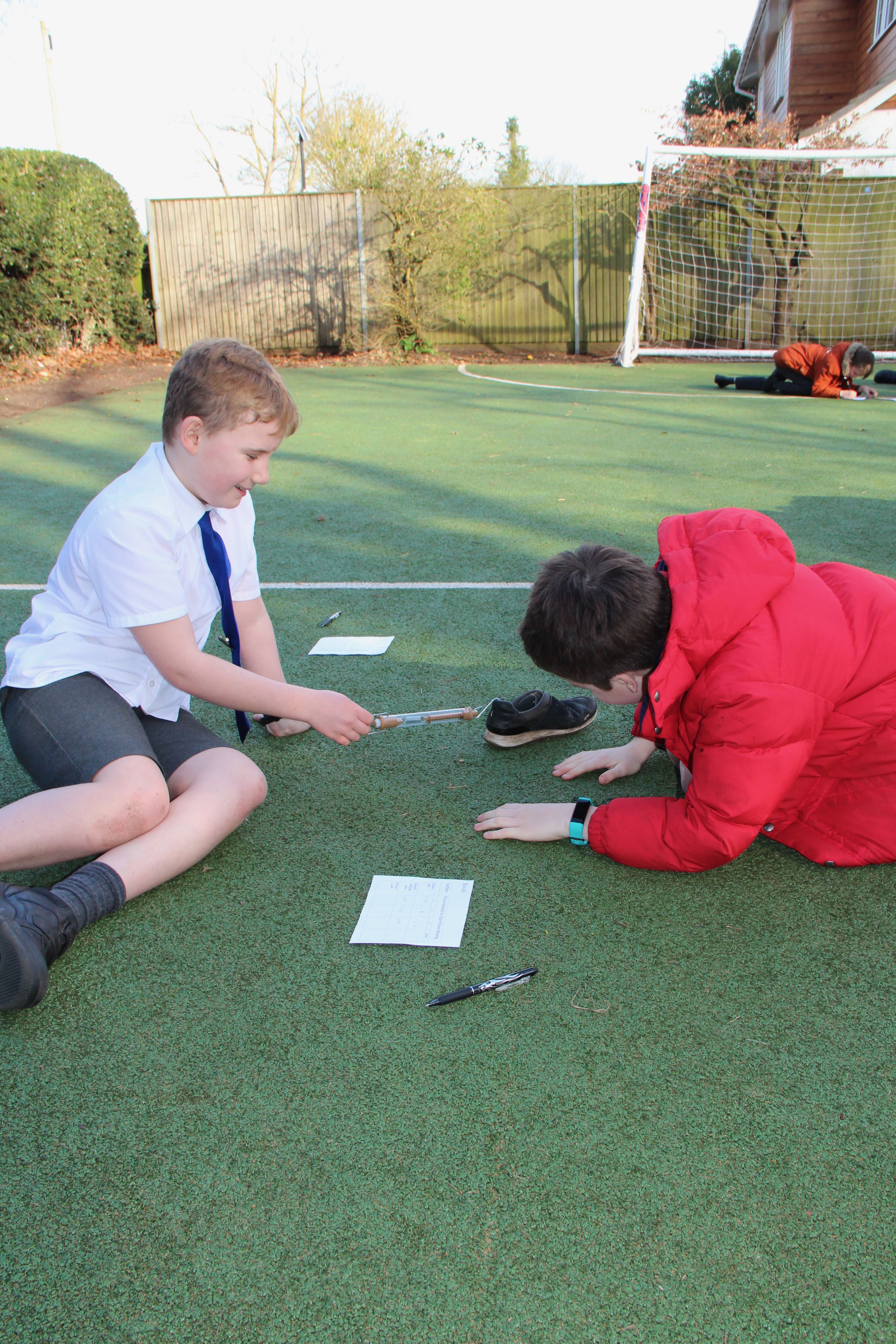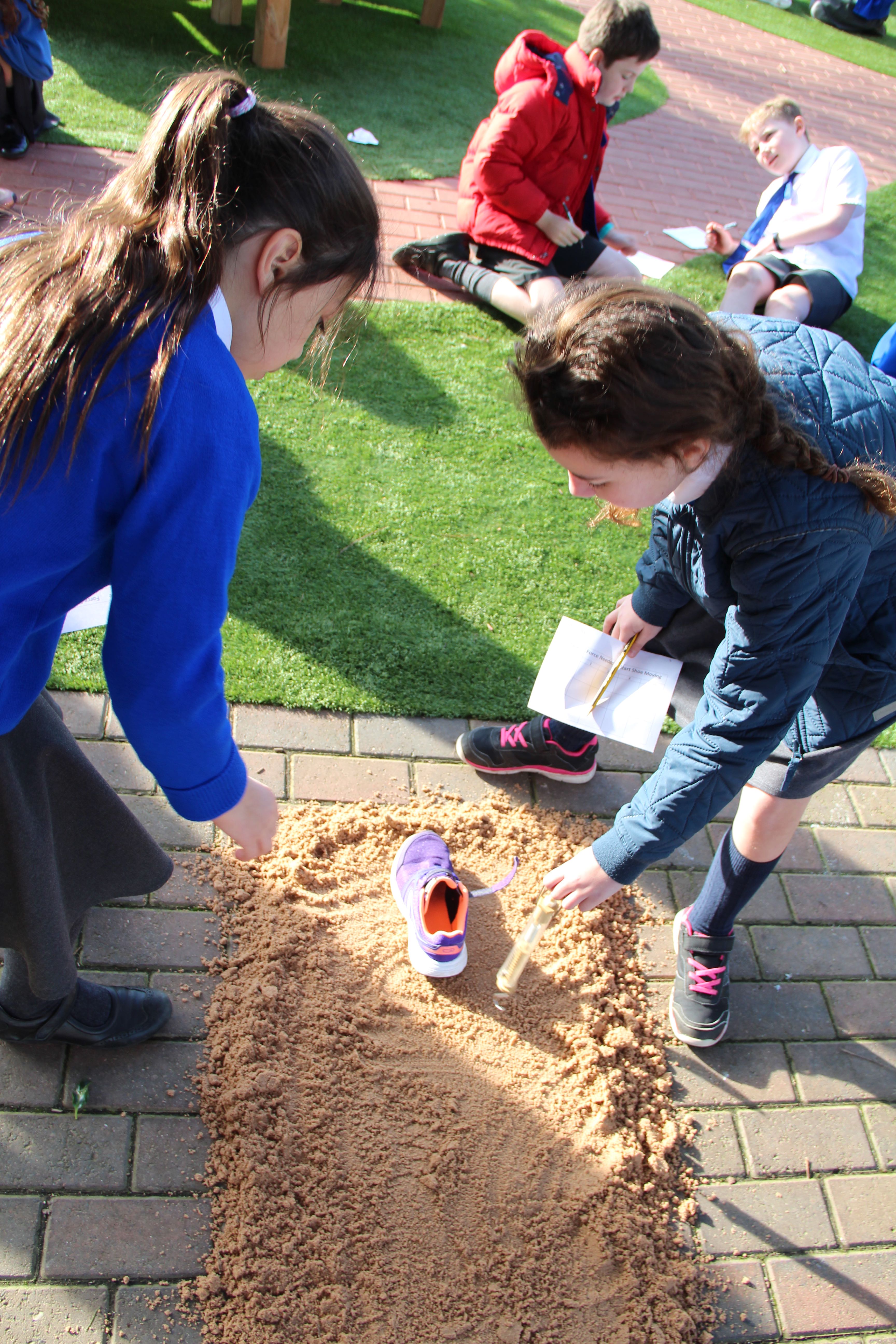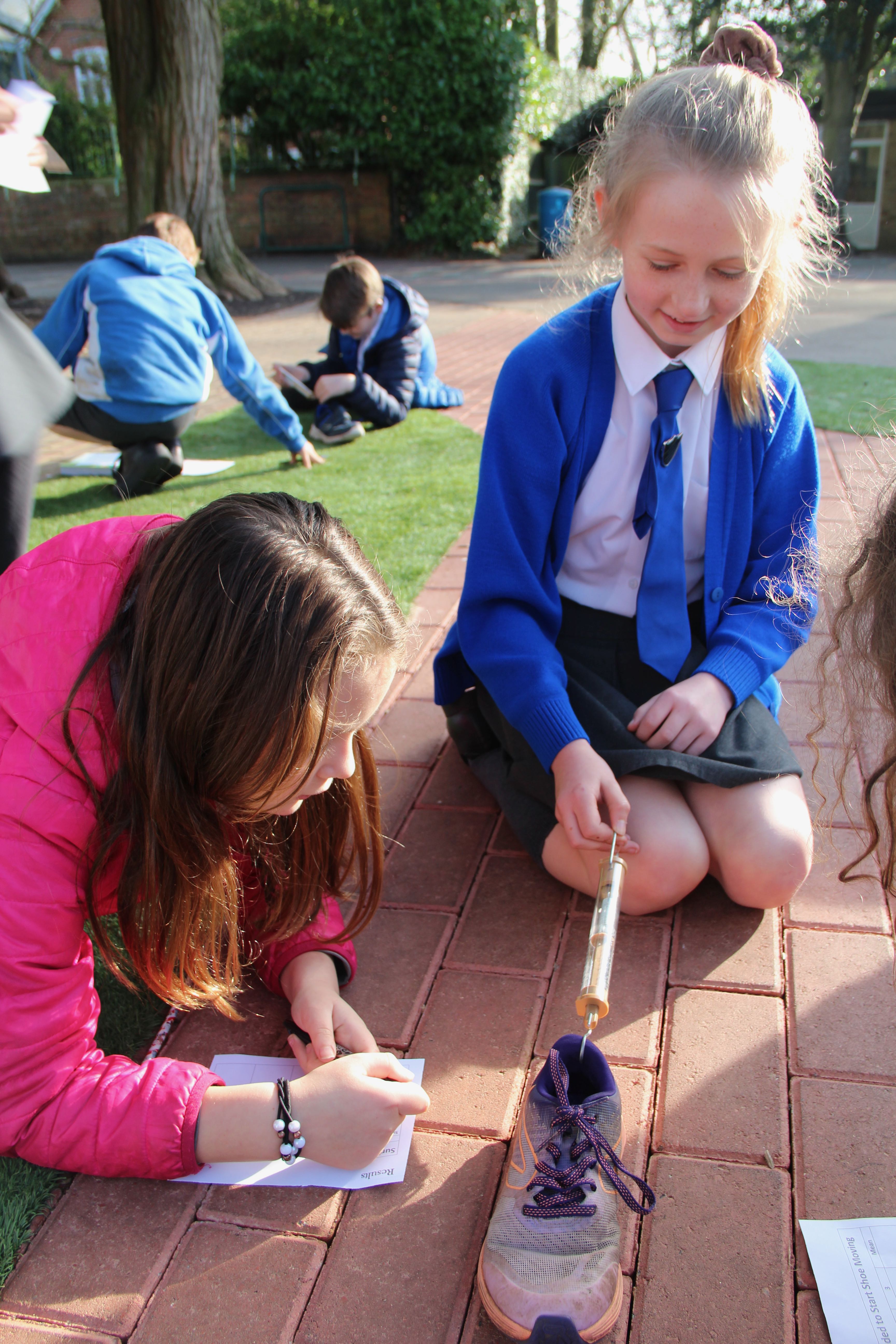 Force meters or spring scales were out in force this afternoon at Shiplake CE Primary School, not something you see everyday. The pupils were measuring fricton levels in newtons( F = μN). They were finding out how much force were needed to move a shoe across different surfaces, in this case, turf, sand and gravel. There were plenty of variables, look at all those different trainers and look at all those children with their varying pulling actions and angles. The newton readings will be variable too.