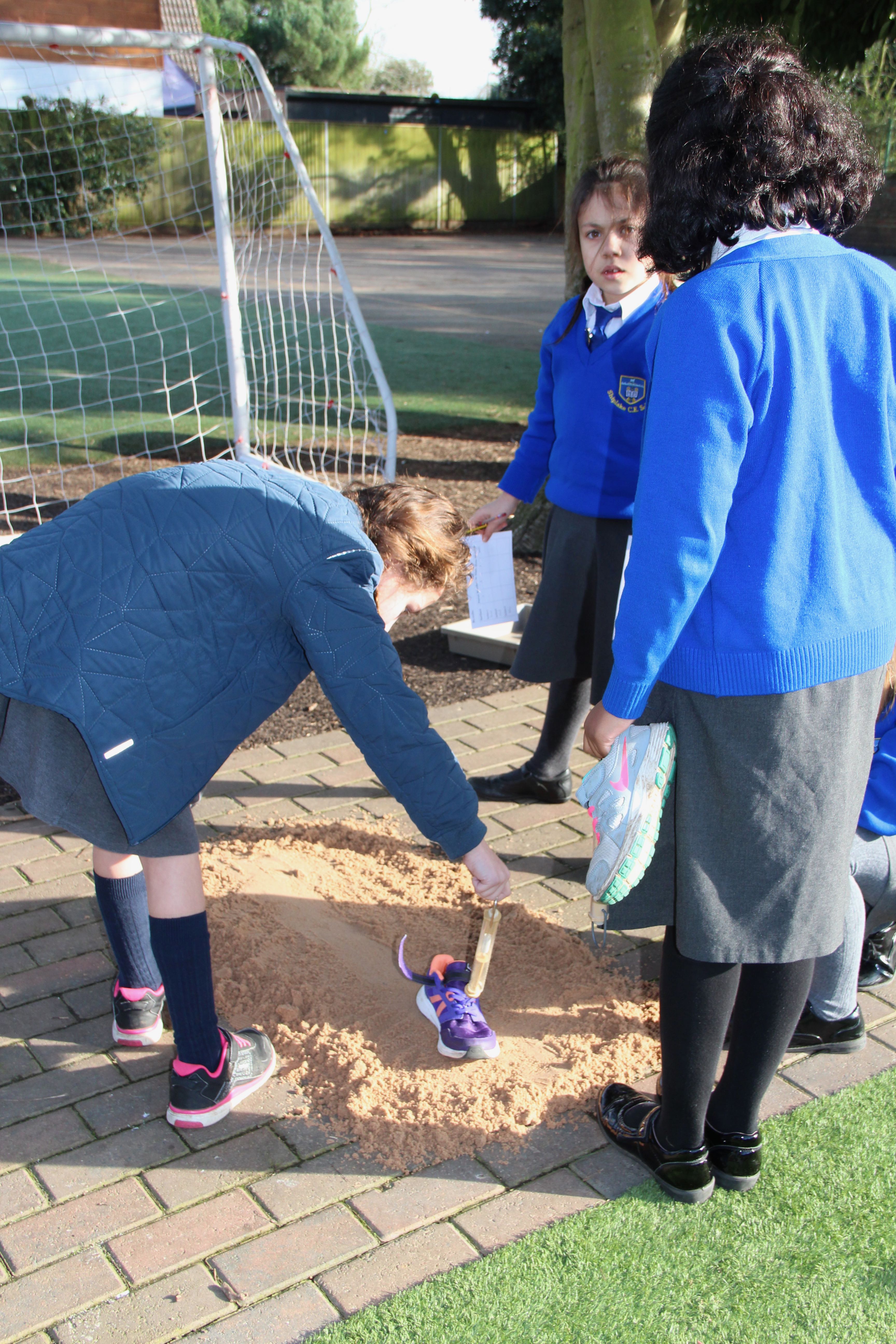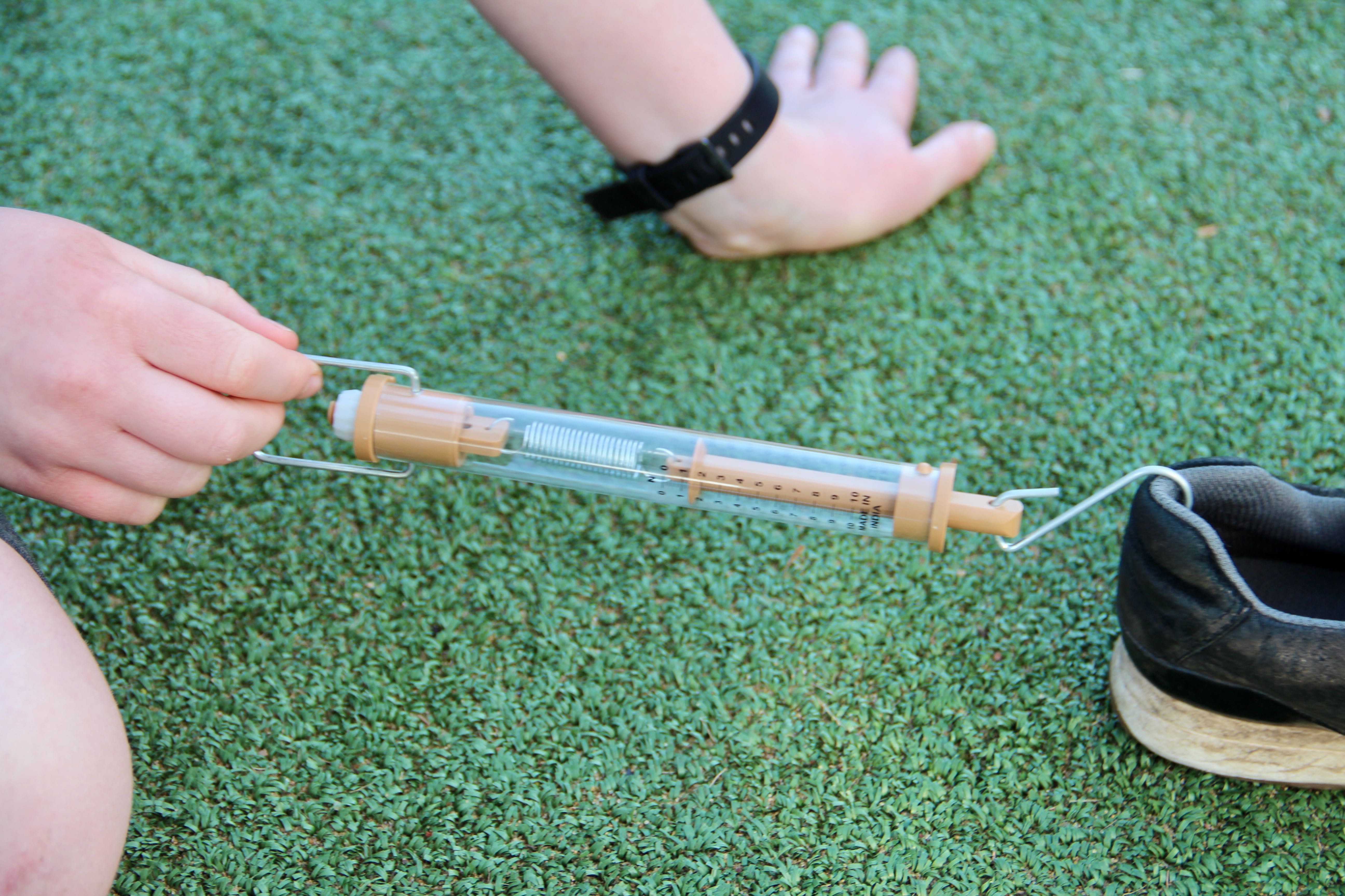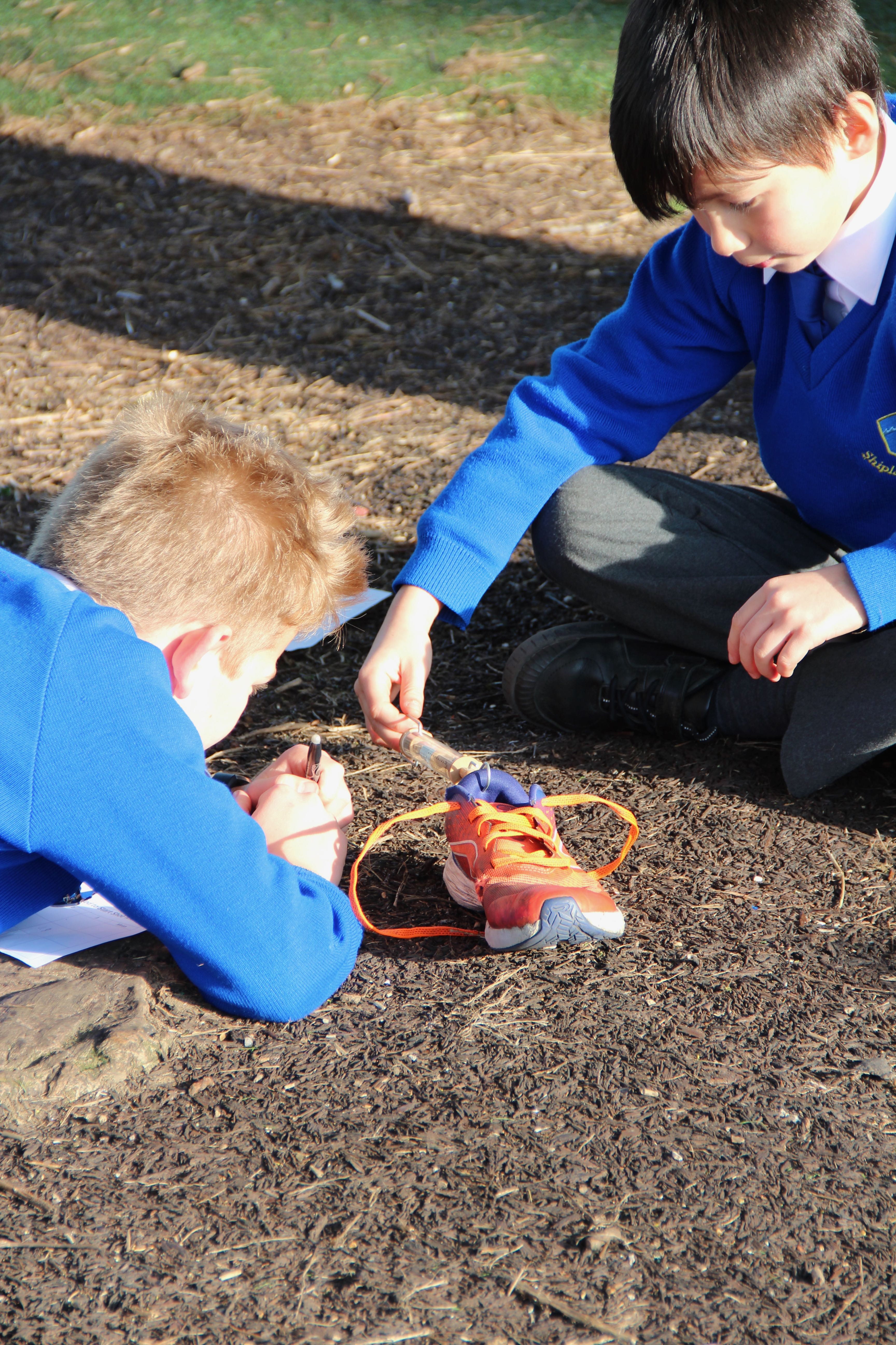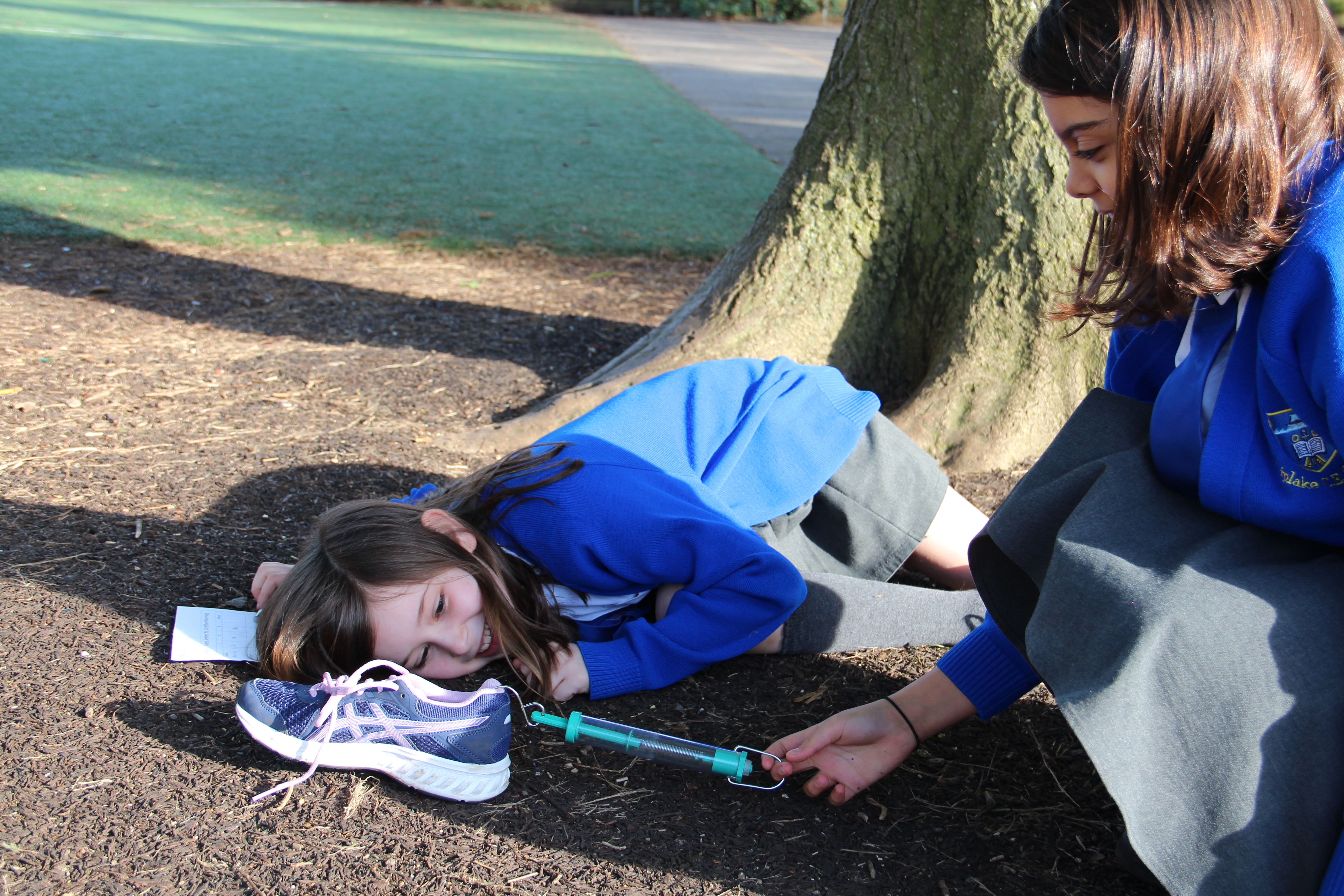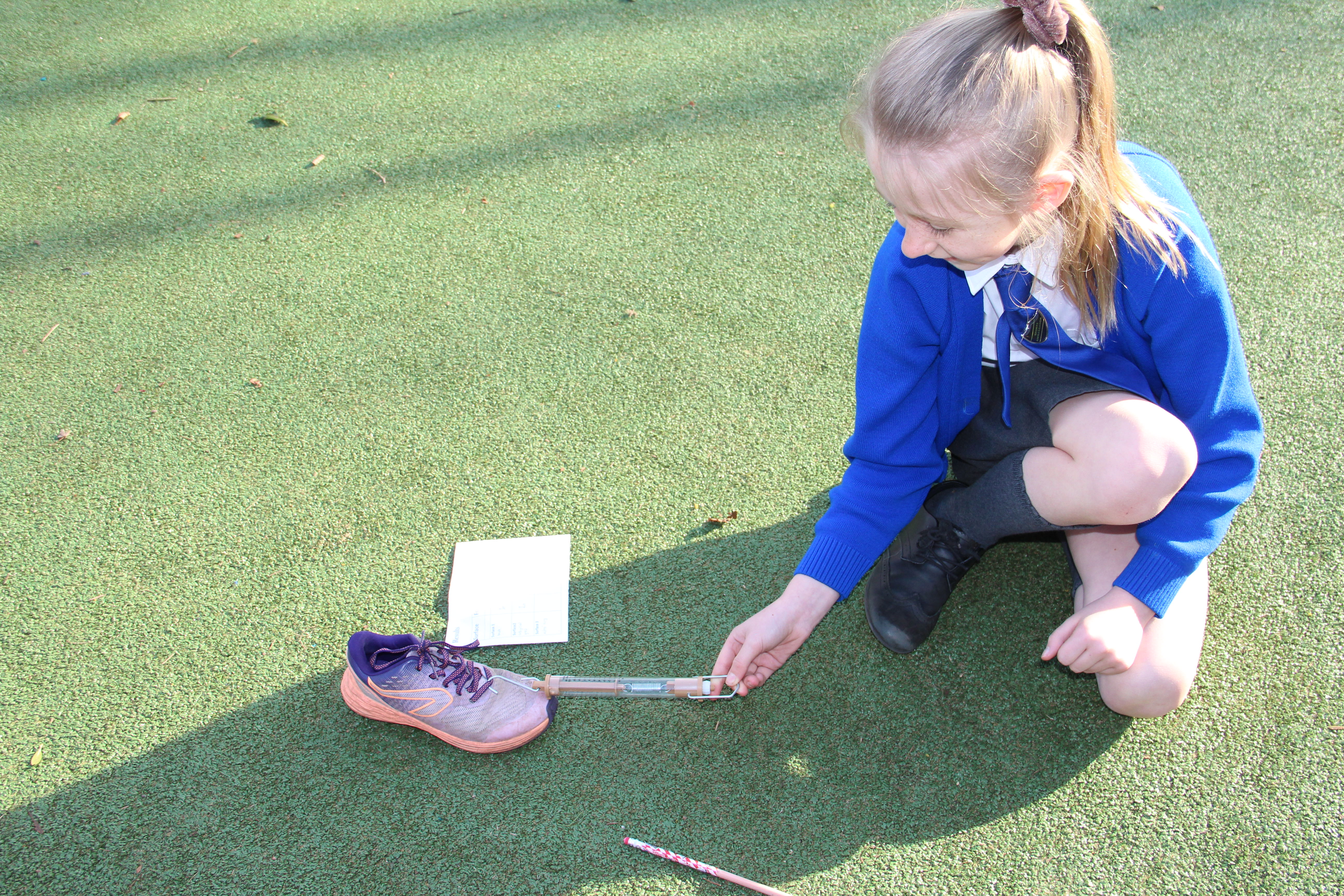 Force meters or spring scales were out in force this afternoon at Shiplake CE Primary School, not something you see everyday. The pupils were measuring fricton levels in newtons( F = μN). They were finding out how much force were needed to move a shoe across different surfaces, in this case, turf, sand and gravel. There were plenty of variables, look at all those different trainers and look at all those children with their varying pulling actions and angles. The newton readings will be variable too.